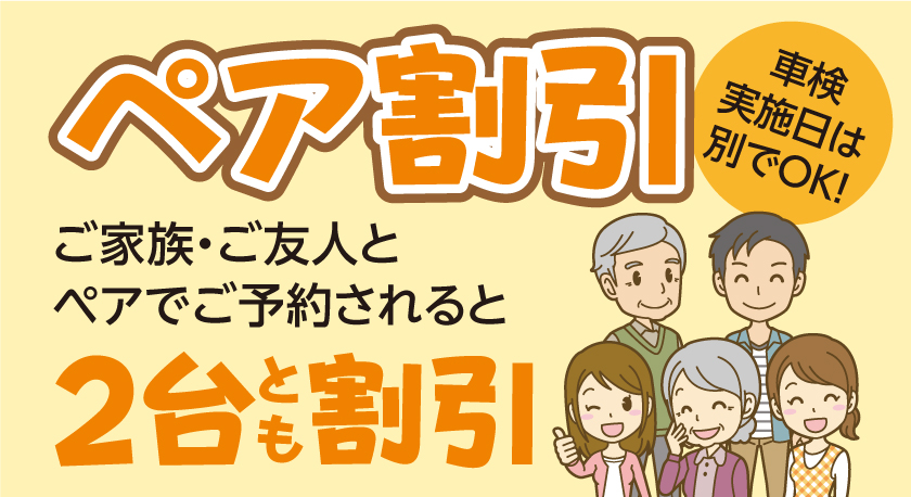 上記例のようにしていただくと「ペア割引1,100円」と「エンジンオイル交換無料券」を車検時に毎回ご利用いただくことができます★