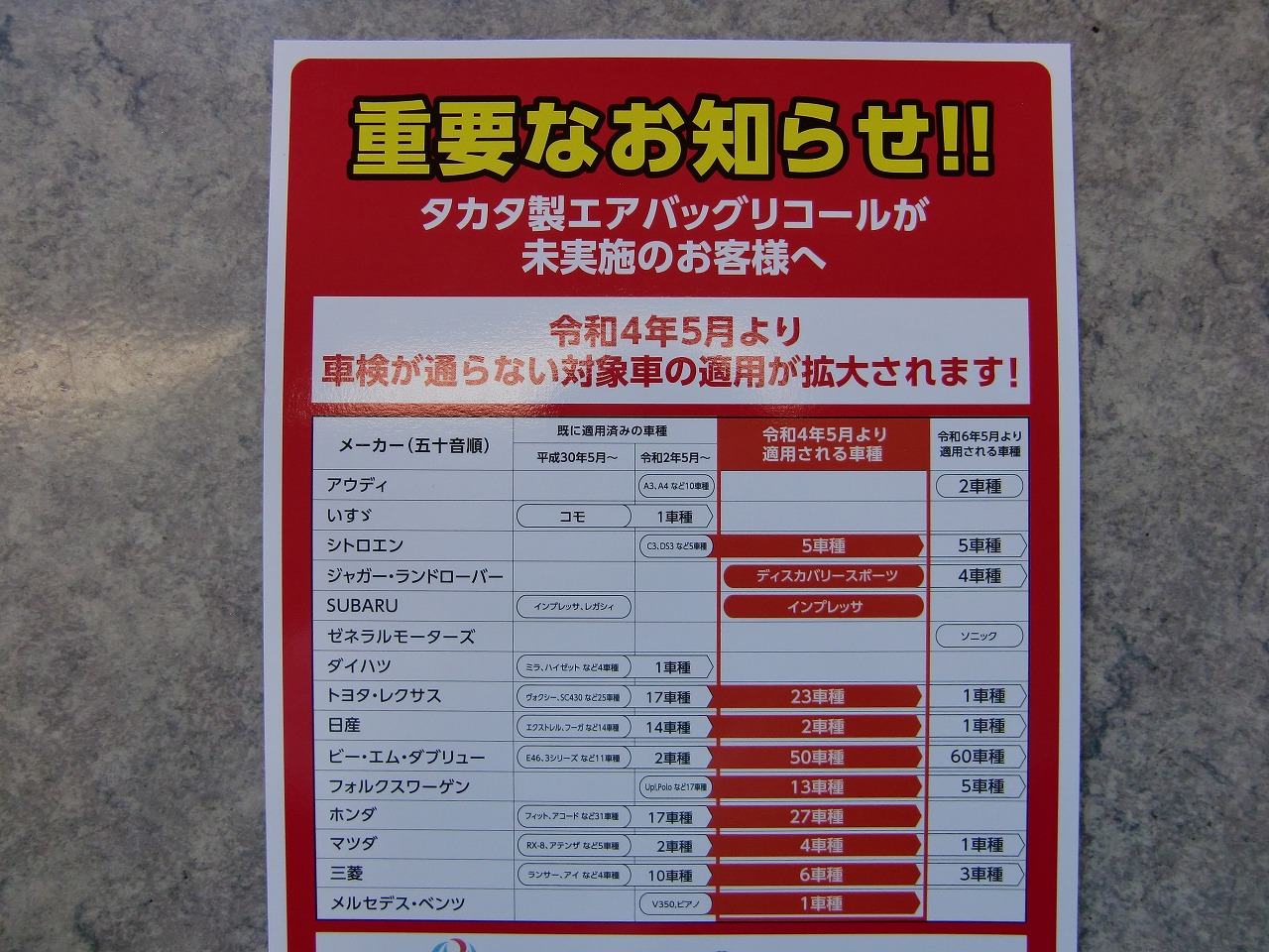 令和4年5月よりタカタ製エアバッグのリコール対象車の適用が拡大されています。